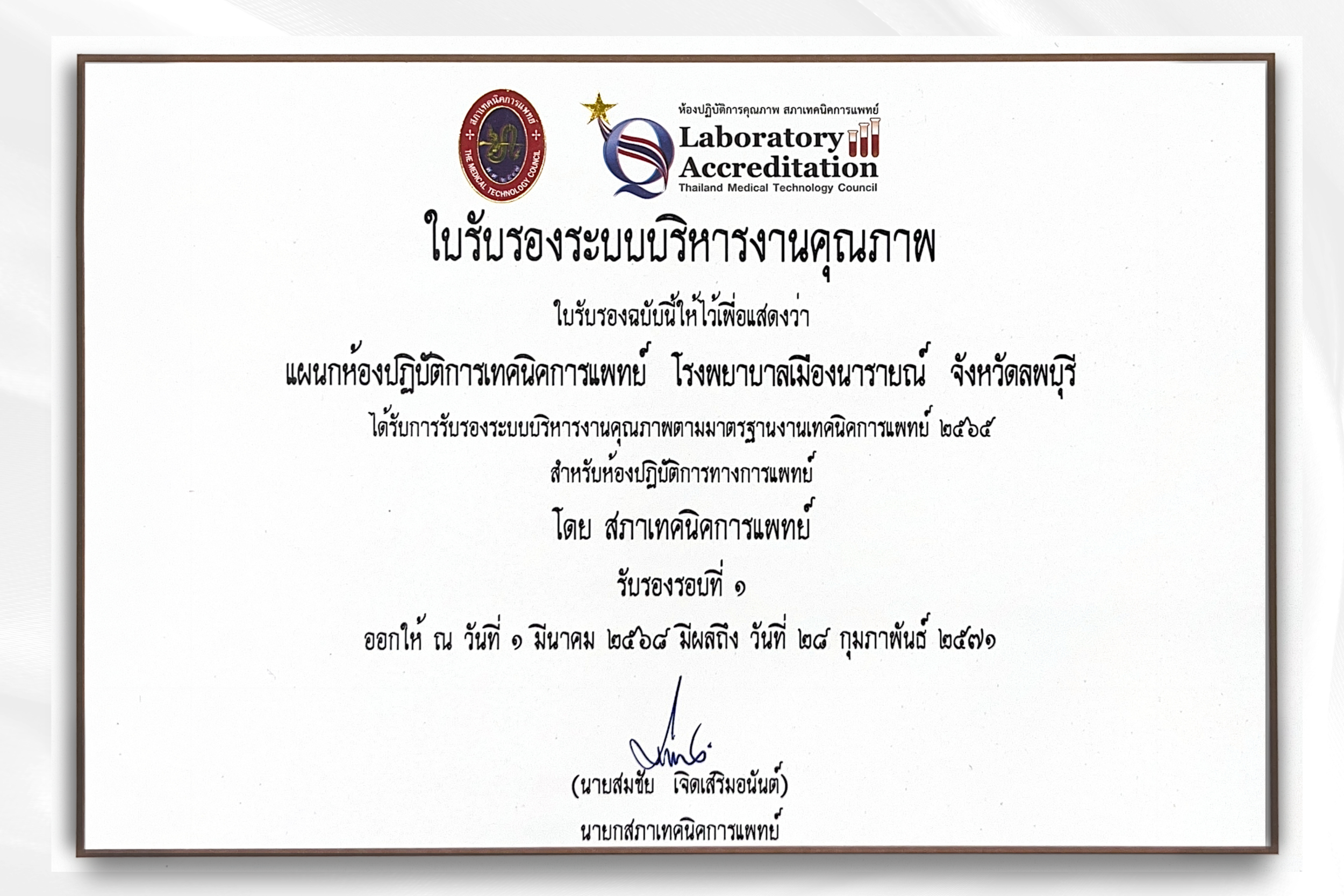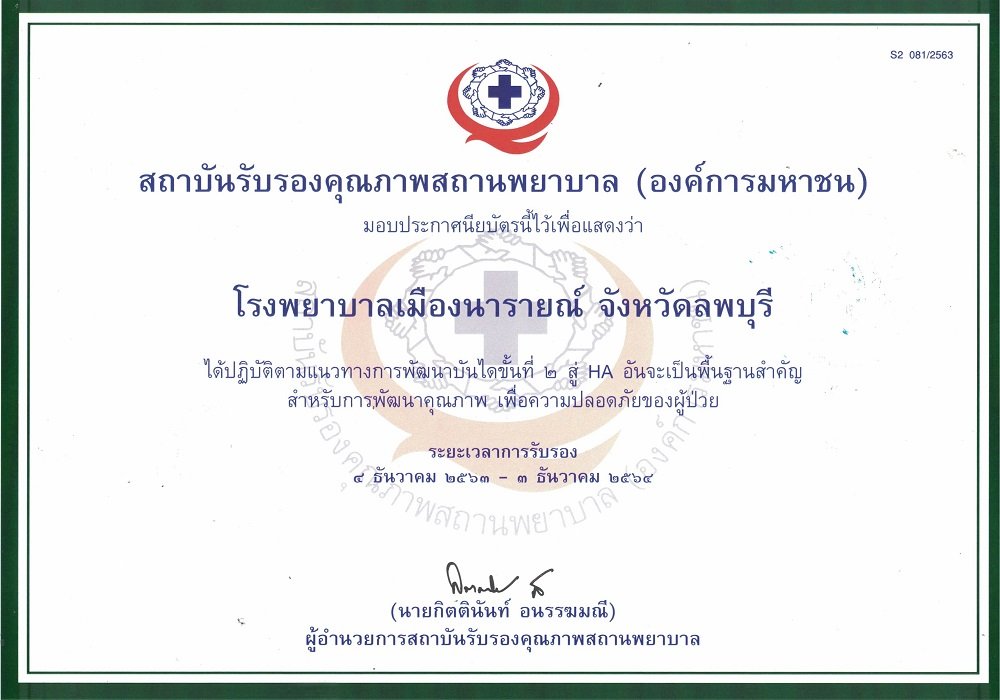 โรงพยาบาลเมืองนารายณ์ ได้ผ่านการรับรองคุณภาพตามมาตรฐาน HA&HPH (Hospital Accreditation ) จากสถาบันรับรองคุณภาพสถานพยาบาล (องค์การมหาชน) ขั้นที่ 3 ตั้งแต่วันที่ 23 กรกฎาคม 2567 ที่ผ่านมา